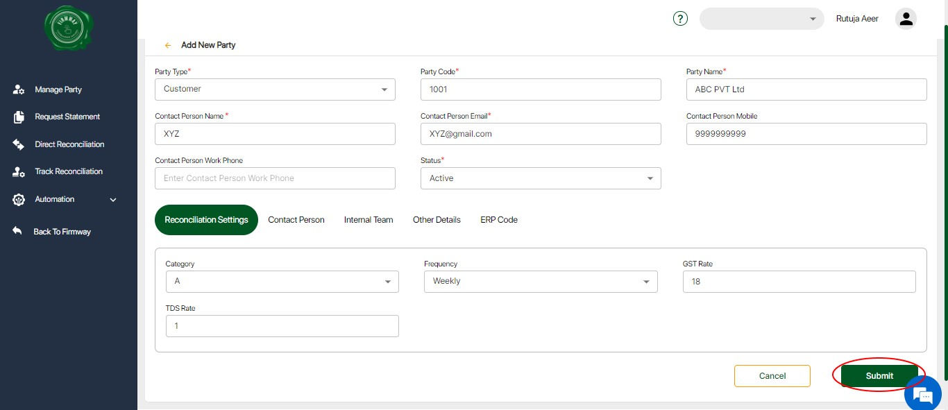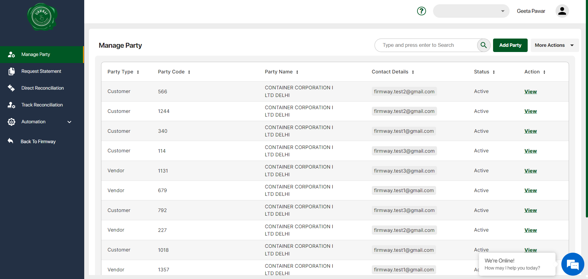 Adding Parties to Firmway Step 1 - Navigate to Manage Party Click on Manage Party > ADD PARTY. Step 2 - Enter Party Details Select Party Type (e.g., Customer). Enter Party Code (e.g., 1001). Enter Party Name (e.g., ABC Pvt Ltd). Enter Contact Person ...