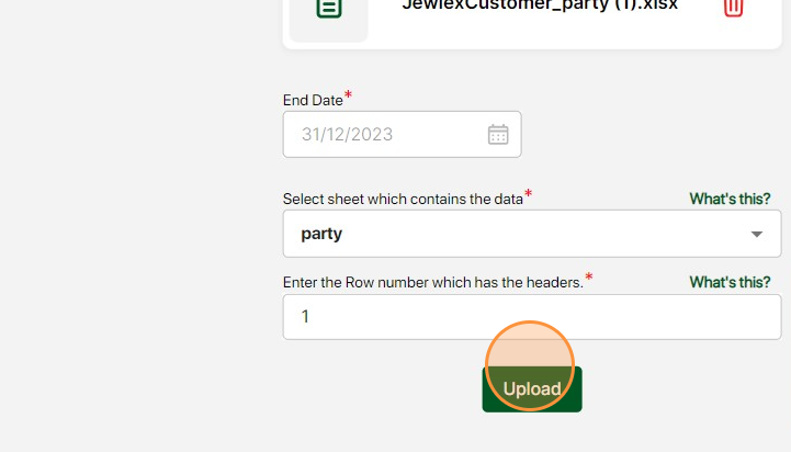2. Confirm Sheet Number - Excel worksheet where the data is added. i.e. party 3. Confirm Header Row Number - The row in there are column headers. i.e. Invoice number, Invoice Date, Doc Type, Amount 4. Select the file and ClickUpload