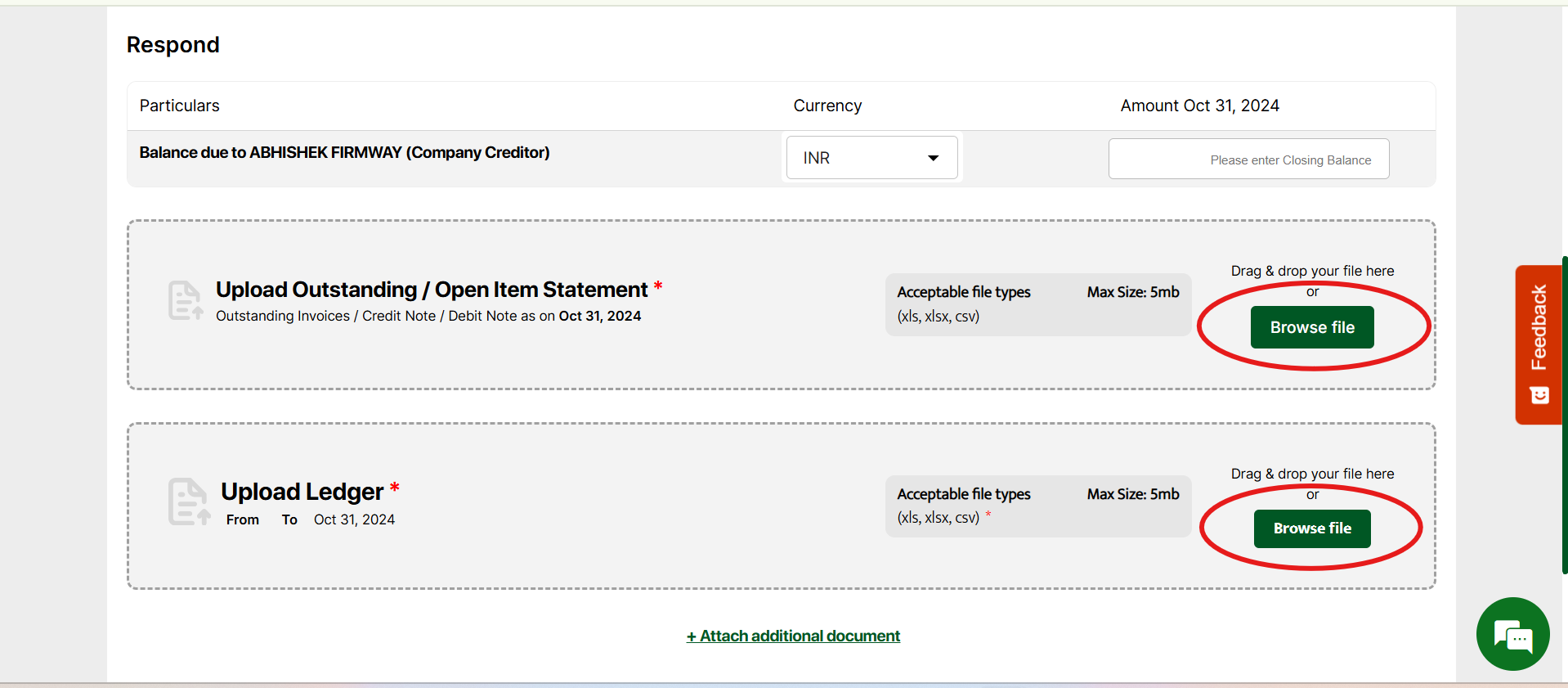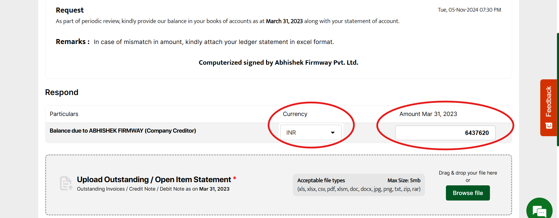 Upload Outstanding/Open Item Statement - Provide the list of Invoice, Credit Note, Debit Notes which are outstanding as on requested date. i.e. 31 March 2023