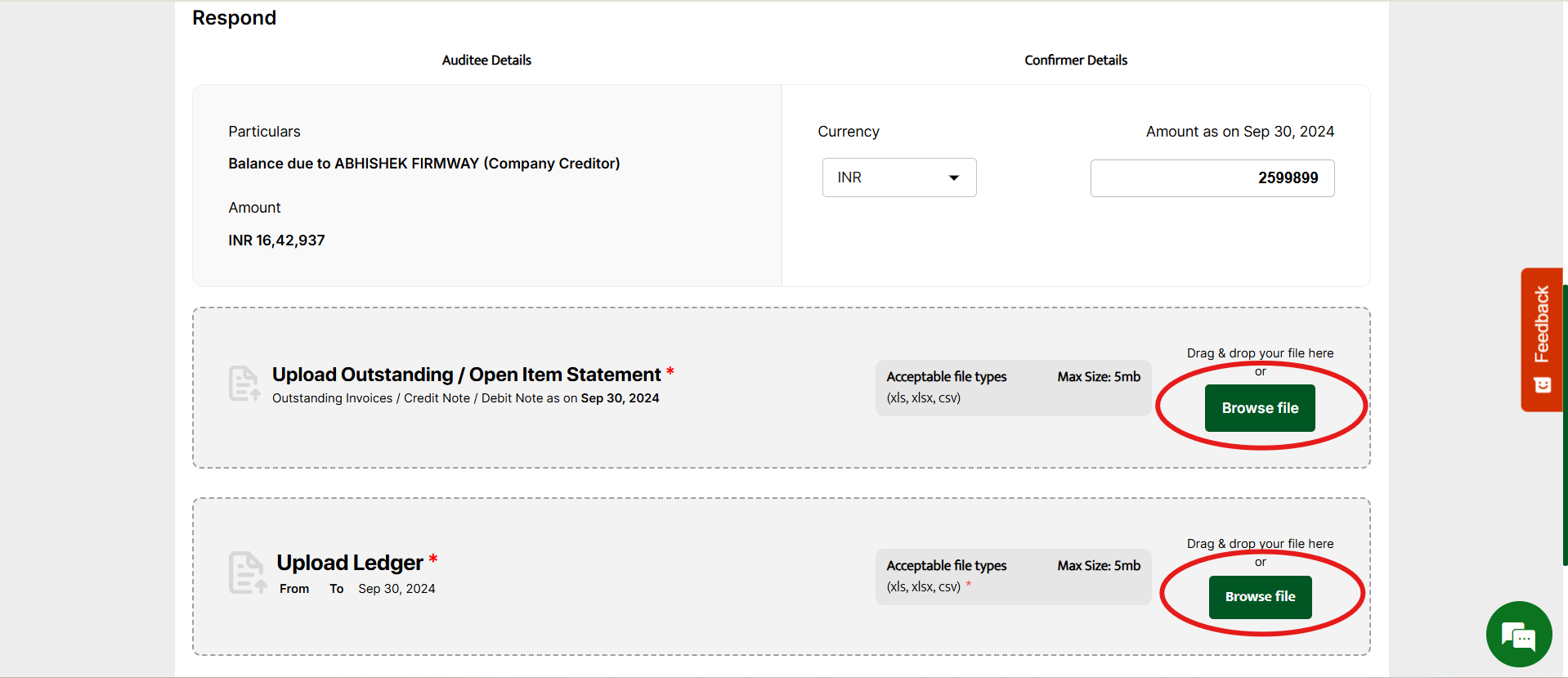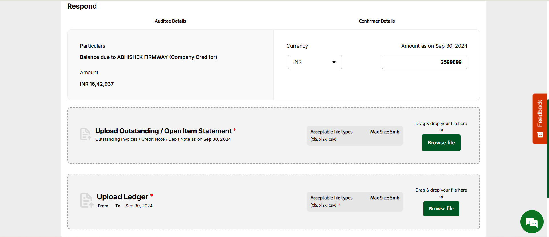 Upload Outstanding/Open Item Statement - Provide the list of Invoice, Credit Note, Debit Notes which are outstanding as on requested date. i.e. 31 March 2023