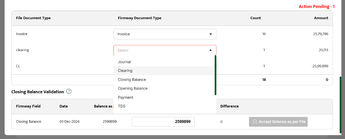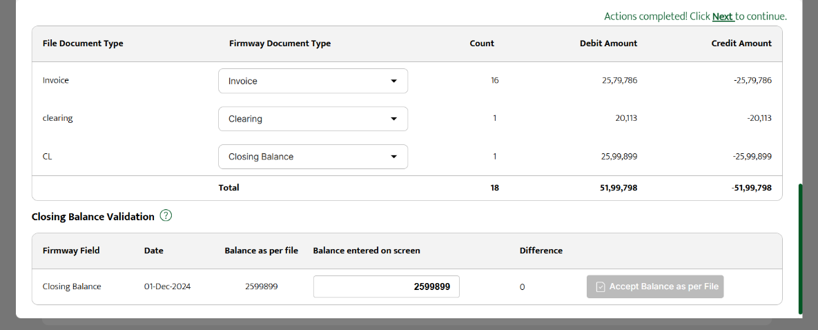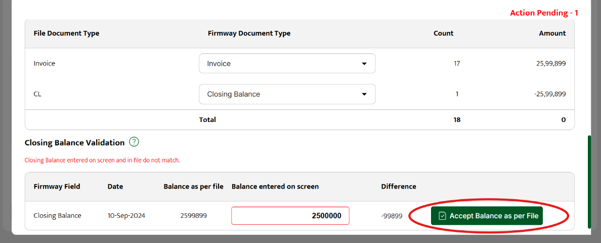 Verify the mismatch between the "Balance as per file" and "Balance entered on Screen" if any. Use "Accept Balance as per file" to rectify the error.