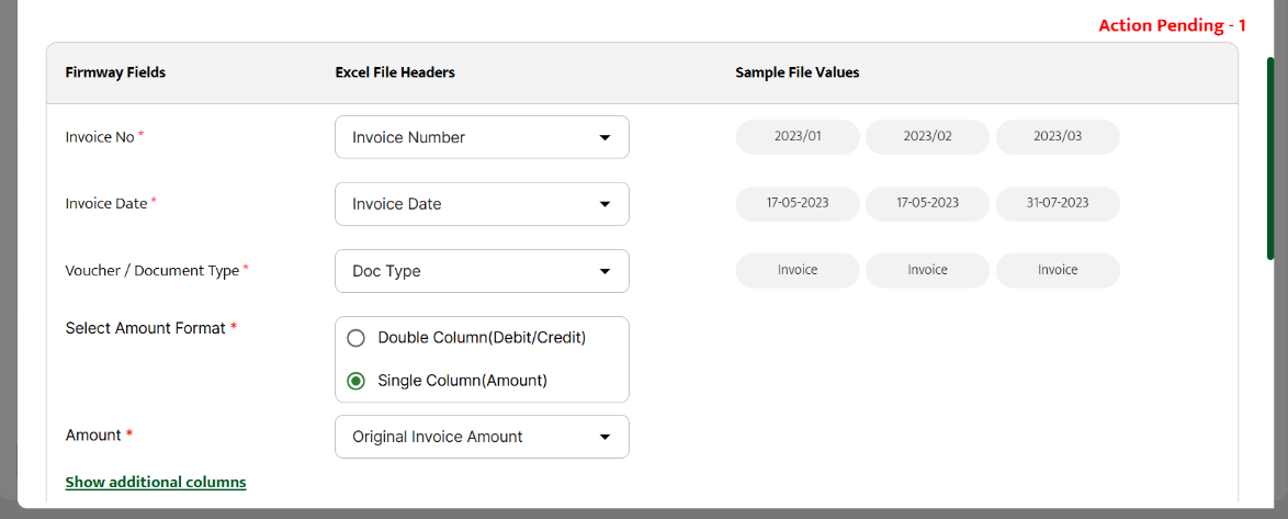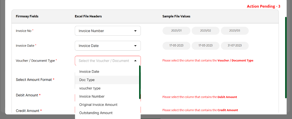 Map the columns that are mandatory.  In the below image, we can see that the "Doc Type" can be mapped to "Voucher/Document Type".